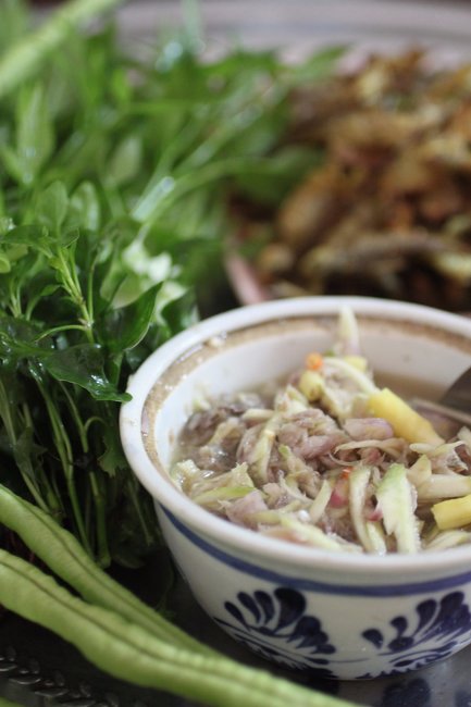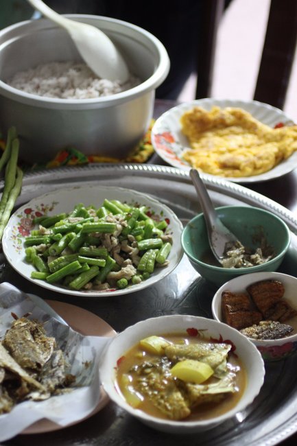 On the menu at the homestay were classic Southern Thai dishes including: gaeng tai pla (fish innards curry), nahm phrik boo doo (a relish of fermented ocean fish sauce, green mango and chilli) and kai jee-o (thai style omelette), all eaten with the delicious local red rice husk-flecked rice and plenty of fresh vegetables and herbs.